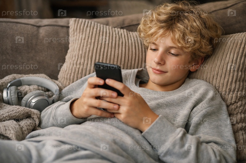 Подросток в уютном свитшоте отдыхает на диване с смартфоном, рядом беспроводные наушники и плед — домашний досуг и цифровые развлечения