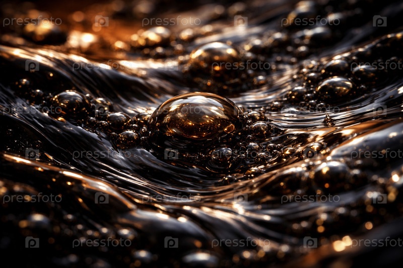 Макросъемка пузырьков и капель на темной жидкой поверхности с золотистыми отражениями — абстрактная блестящая текстура для фона и дизайна