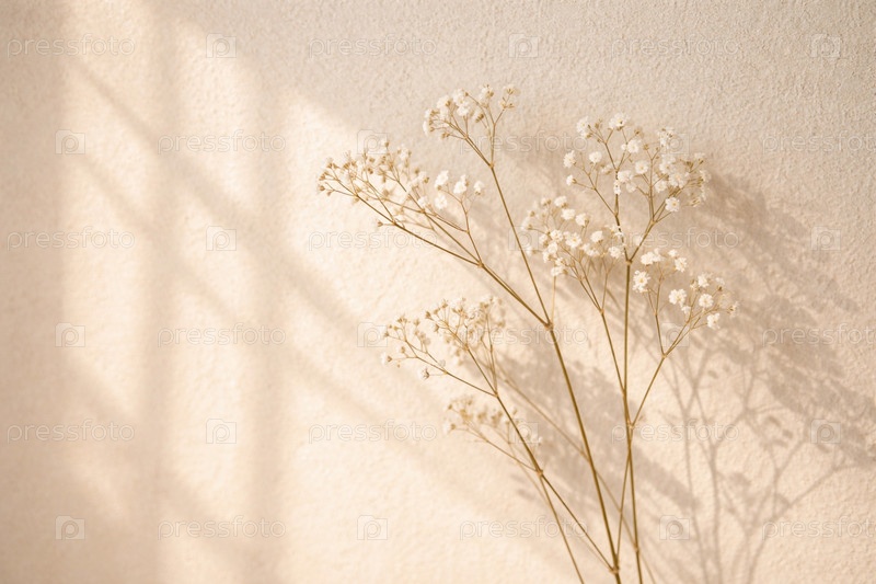 Минималистичный натюрморт: сухая гипсофила на бежевой текстурной стене с мягкими тенями и теплым естественным светом