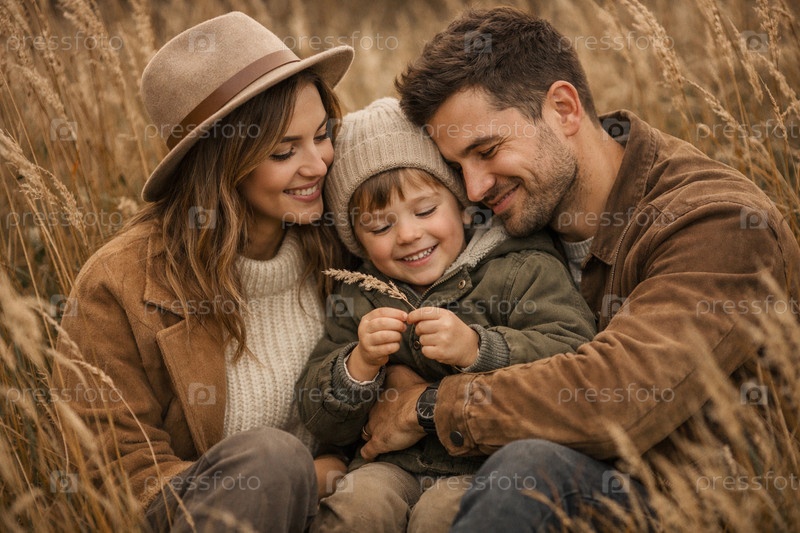 Семейная осенняя прогулка в золотом поле: молодые родители с маленьким ребенком в уютной одежде в стиле бохо, теплые естественные тона и мягкий свет