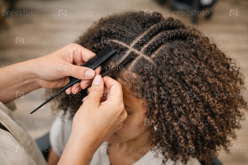 Парикмахер плетет тонкие корнроу-косички на густых натуральных кудрявых волосах — крупный план рук, гребня и техники плетения в салоне красоты