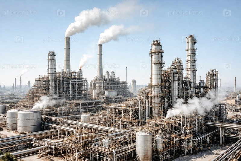 Панорамный вид на крупный нефтеперерабатывающий завод: сложная сеть трубопроводов, резервуаров и дымовых труб с паром и выбросами на фоне ясного неба