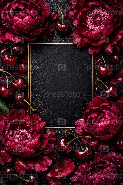 Темная роскошная композиция: золотая рамка на черном текстурированном фоне в окружении бордовых пионов и спелых вишен в каплях росы — место для текста