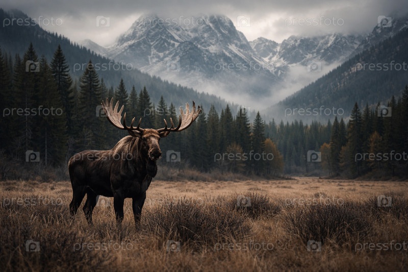 Величественный самец лося (Alces alces) на лужайке в горной долине: туманный хвойный лес, осенние высокие травы и заснеженные вершины на фоне облачного утра