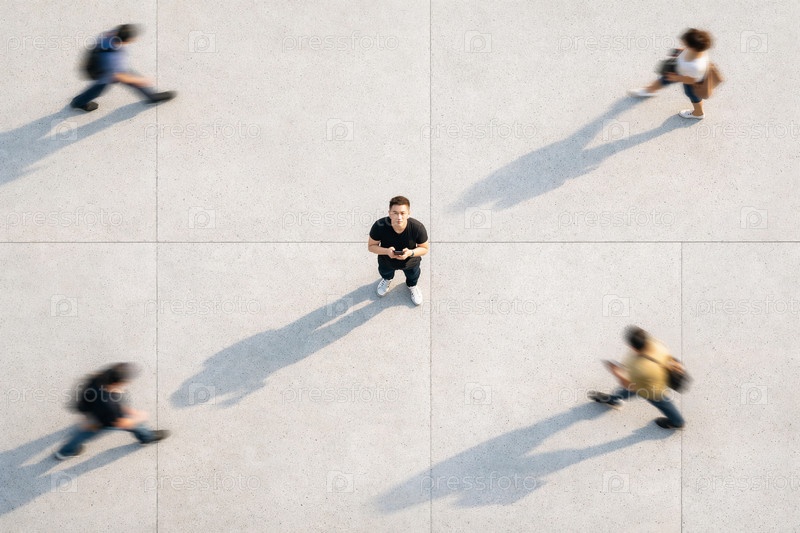 Вид сверху: молодой парень стоит с телефоном на бетонной городской площади среди проходящих пешеходов — контраст неподвижности и движения, длинные тени, летний урбанистический кадр