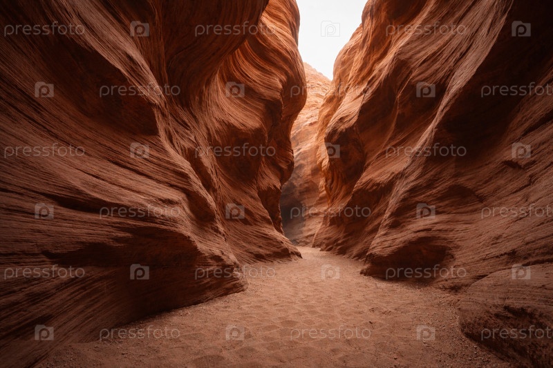 Узкий песчаниковый слот-каньон с волнистыми красными стенами и песчаной тропой, игра света и тени в слоистых скальных формациях