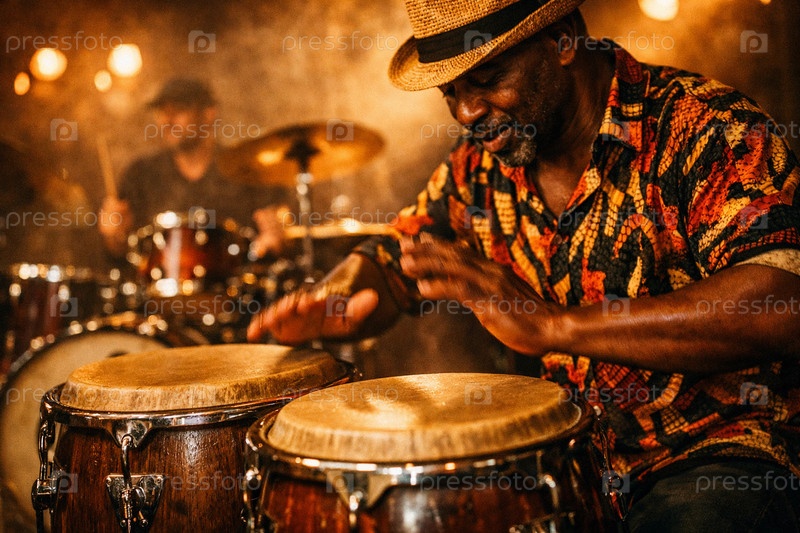 Музыкант играет на конгах/барабанах во время живого концерта — крупный план рук и барабанной секции