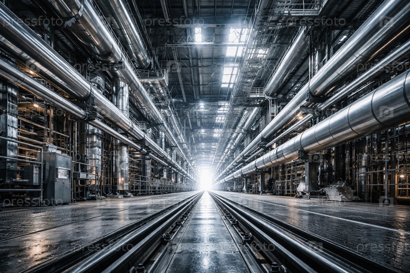 Индустриальный коридор заводского цеха с магистральными трубопроводами и рельсами, перспективный вид из нержавеющей стали с ярким светом в конце и симметричной линейной композицией