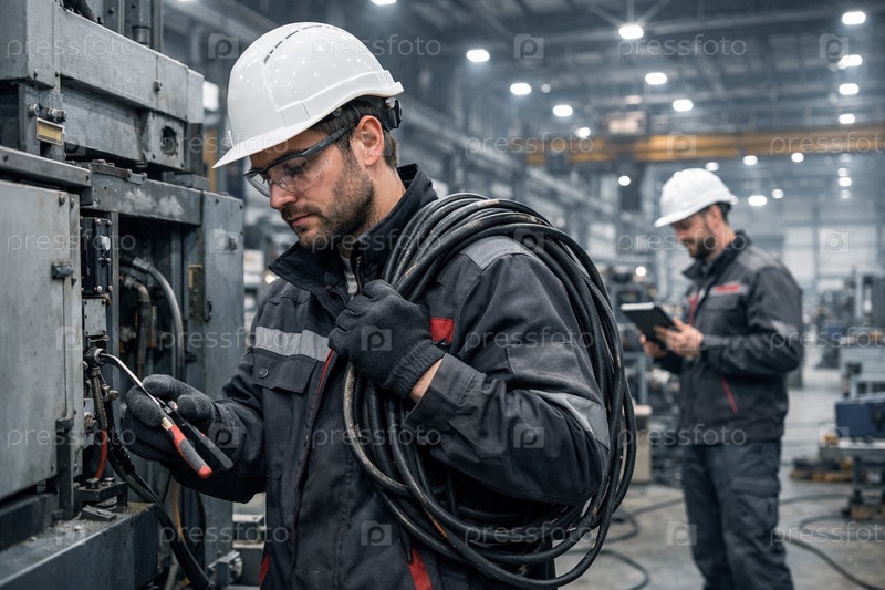 Электромонтеры в промышленном цехе проводят техническое обслуживание и проверку электрооборудования: перенос бухты кабеля, контроль соединений и замеры с помощью ручных инструментов и планшета оператора