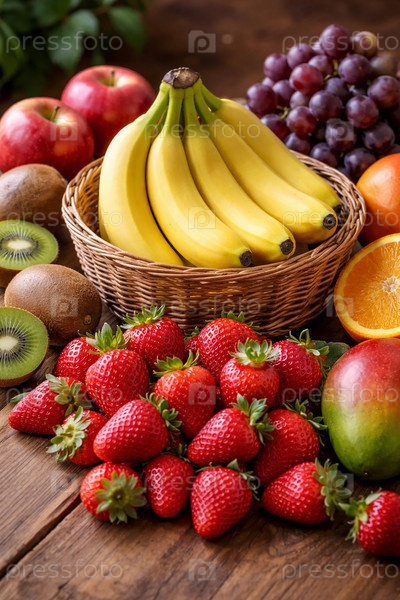 Яркий натюрморт из свежих спелых фруктов: корзина с бананами, сочная клубника в первом плане, киви, красные яблоки, гроздь винограда, долька апельсина и манго на деревянном столе