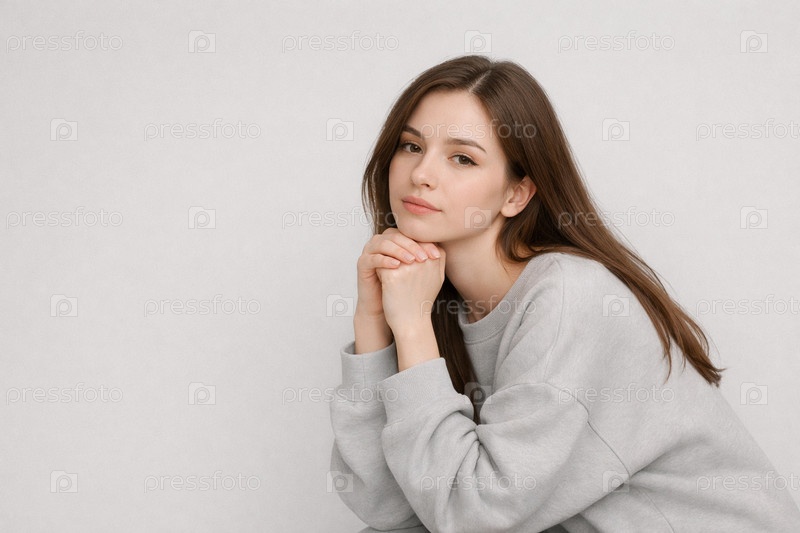 Задумчивый портрет молодой женщины в сером свитшоте, полуоборот, руки у подбородка, нейтральный светлый фон — минималистичная студийная композиция, концепция спокойствия и самоанализа
