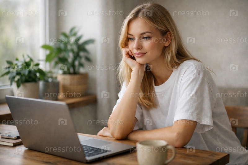 Задумчивая молодая женщина в белой футболке работает за ноутбуком с кружкой кофе в уютном домашнем интерьере с комнатными растениями