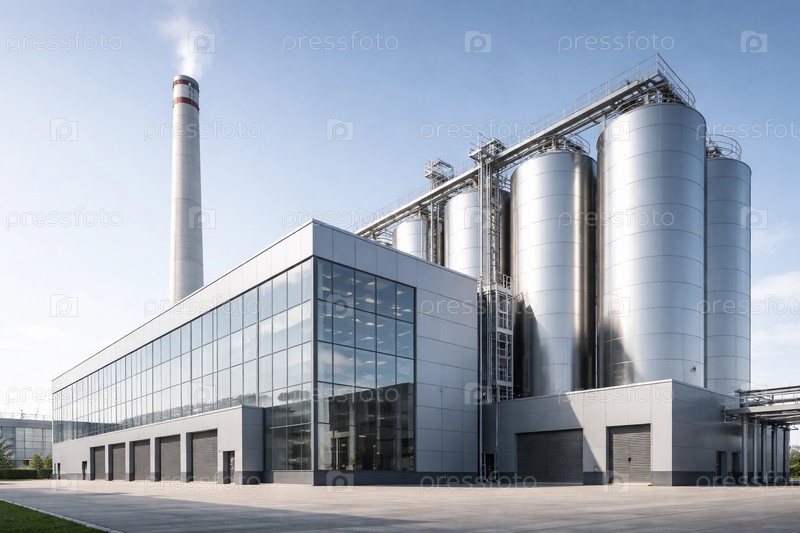 Современный производственный комплекс с крупными полированными стальными силосами для хранения, стеклянным административным корпусом и высокой дымовой трубой на фоне чистого неба, просторная зона разгрузки и инженерные коммуникации