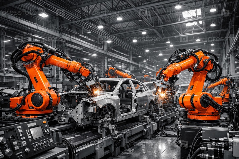 Автоматизированная автомобильная сборочная линия: оранжевые промышленные роботы-манипуляторы выполняют сварку кузова на конвейере в просторном заводском цехе