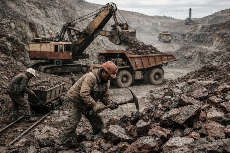 Рабочий с киркой в открытом карьере: добыча руды на фоне экскаватора и самосвалов в суровом промышленном ландшафте
