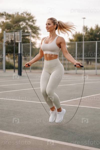 Женщина в спортивном комплекте прыгает через скакалку на уличной спортивной площадке — кардио и функциональная тренировка на свежем воздухе, динамичное упражнение для развития выносливости, тонуса мышц и координации