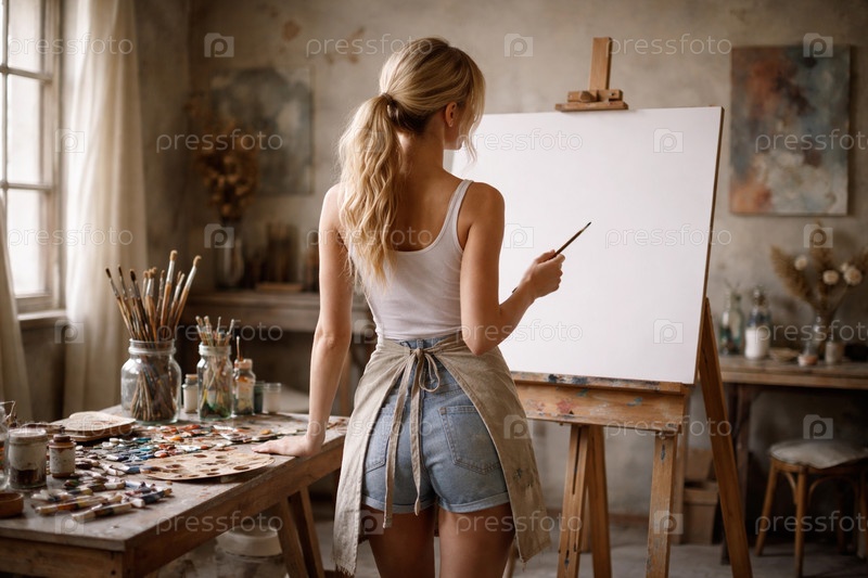 Молодая художница в светлой уютной студии стоит у мольберта с чистым холстом, держит кисть, в джинсовых шортах и рабочем фартуке, на столе палитра и банки с красками