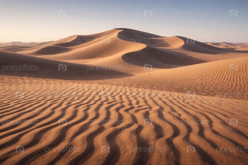 Пустынные барханы и волнообразная рябь на песке при золотом свете — текстурный панорамный пейзаж аридной пустыни