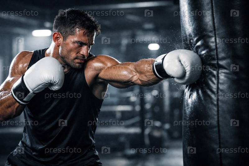 Мощный боксер наносит прямой удар по тяжелому мешку в спортивном зале — динамичный кадр с акцентом на рельефные мышцы руки, всплеск пота и драматическое контровое освещение для спортивной фотосессии