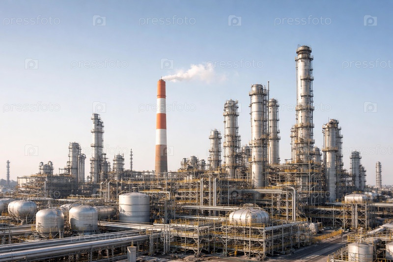 Панорамный вид на крупный нефтеперерабатывающий завод: сложная сеть трубопроводов, резервуаров и дымовых труб с паром и выбросами на фоне ясного неба