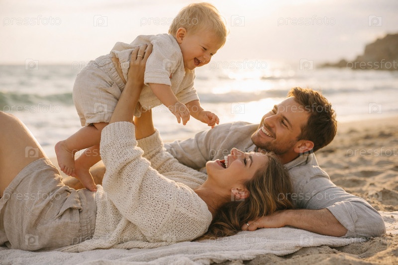 Молодая счастливая семья на пляже на закате: мама и папа лежат на пледе у моря и играют с маленьким ребенком, теплый золотой свет, уютная одежда и нежные семейные эмоции