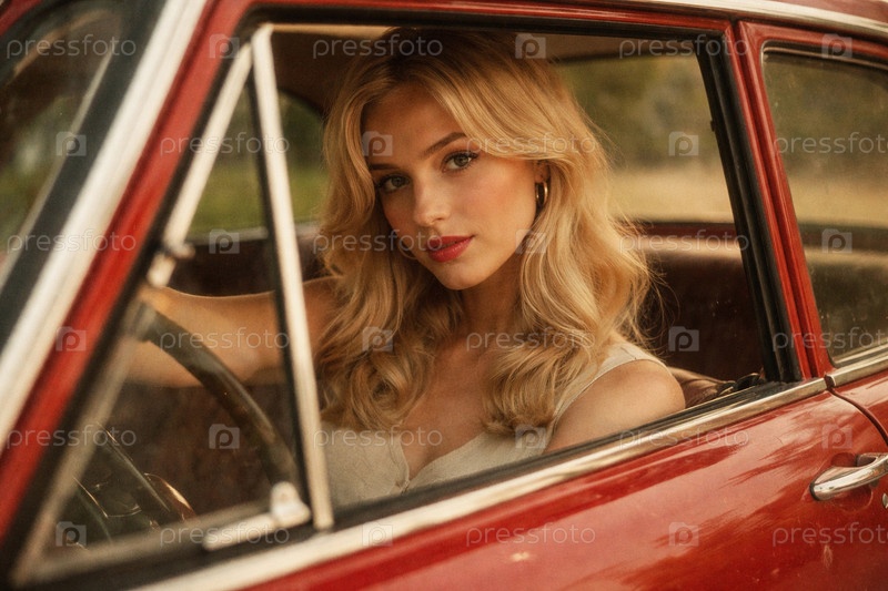 Ретро-портрет женщины с распущенными светлыми светлыми волосами в красном винтажном автомобиле: летняя загородная поездка в кинематографическом теплом свете
