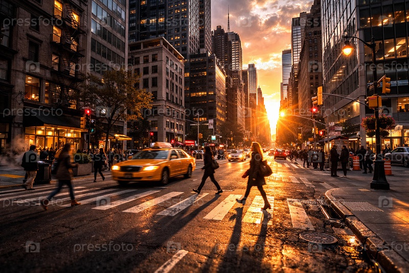 Городской закат в мегаполисе: пешеходы переходят перекресток на фоне небоскребов и желтого такси в золотом сиянии заката