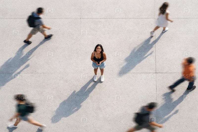 Вид сверху: молодая женщина стоит с телефоном на бетонной городской площади среди проходящих пешеходов — контраст неподвижности и движения, длинные тени, летний урбанистический кадр