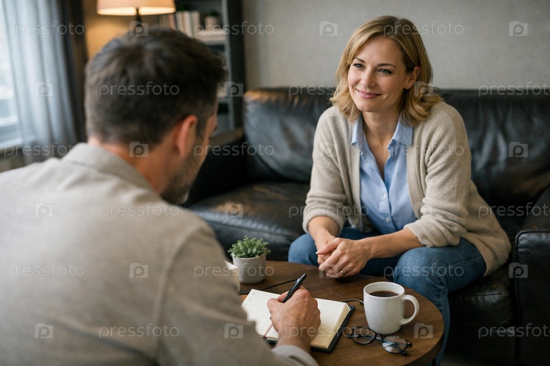 Психологическая консультация в уютной гостиной: терапевт делает записи в блокноте во время беседы с клиенткой на кожаном диване, на столике чашка кофе и очки
