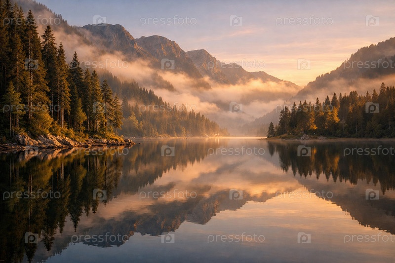 Тихое горное озеро на рассвете с зеркальным отражением хвойного леса и туманных вершин