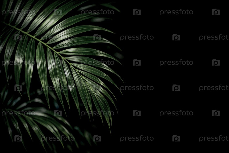 Крупный план тропических пальмовых листьев на черном фоне — текстурная минималистичная композиция зеленых листьев для фонового использования, декоративного оформления и ботанических проектов
