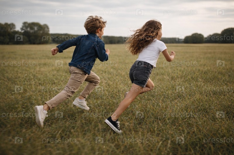 Дети бегут по летнему лугу — мальчик и девочка (вид сзади), активная игра и свобода на свежем воздухе в загородном пейзаже