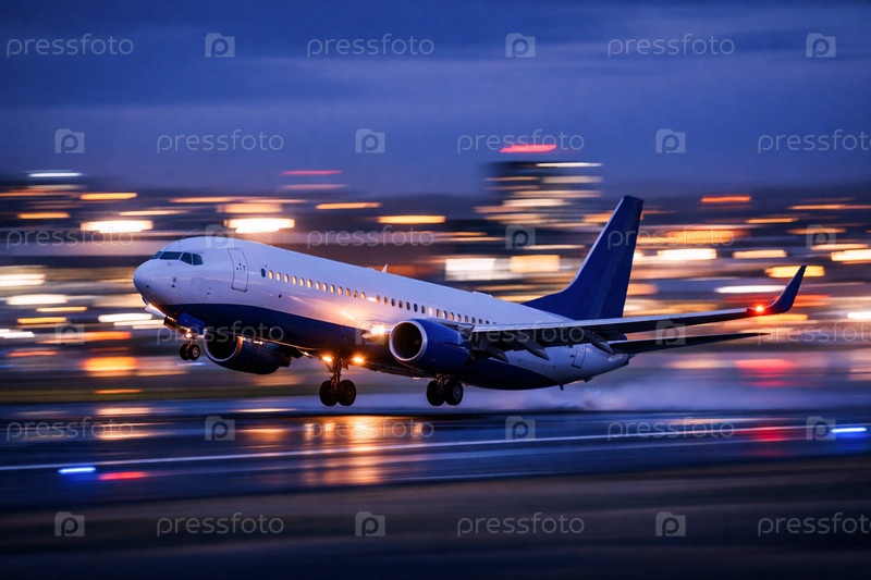 Коммерческий пассажирский самолет / авиалайнер при взлете в сумерках на фоне размытого городского освещения и отражений на взлетно-посадочной полосе