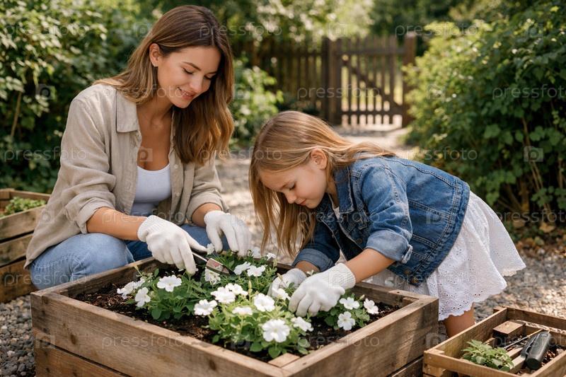 Мать и дочь сажают белые цветы в деревянный приподнятый цветочный ящик в загородном саду — совместный семейный садовый проект