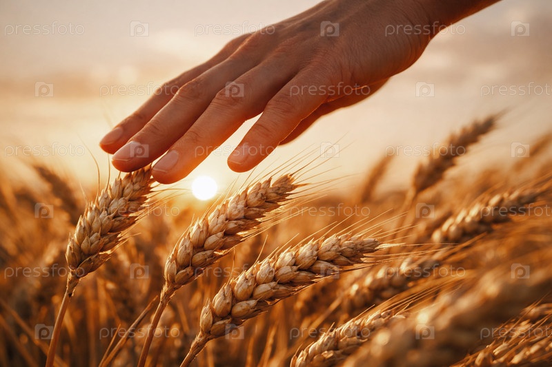 Крупный план: рука скользит по золотым колосьям пшеницы в поле на фоне закатного солнца, сельскохозяйственный пейзаж зрелого урожая