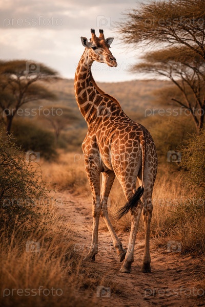Африканский жираф, идущий по пыльной тропе в саванне среди акаций в золотой час на закате