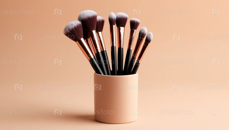 Макияжные кисти в стакане на пастельно-бежевом фоне