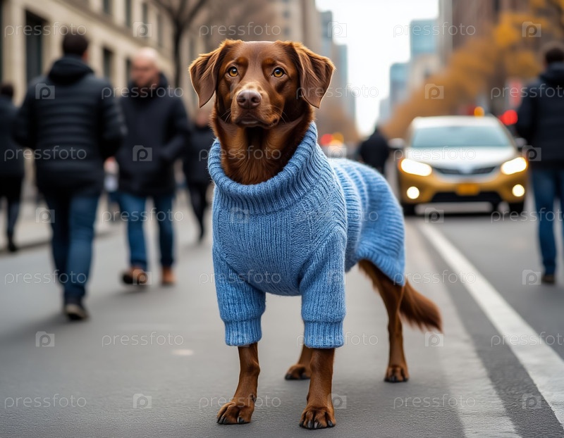 Собака в теплом вязанном свитере полное тело городская улица