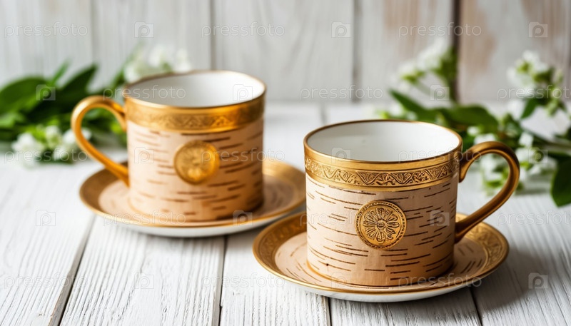 Две экологически чистые чайные чашки из березовой коры с золотым декором