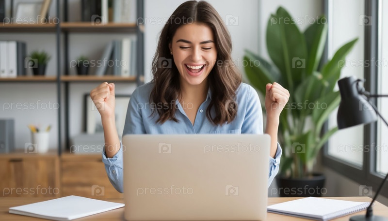 Счастливая молодая женщина, студент или сотрудник, получающая хорошие новости по электронной почте, поднимает руки