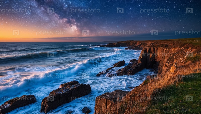 Прекрасный ночной морской пейзаж со звездным небом