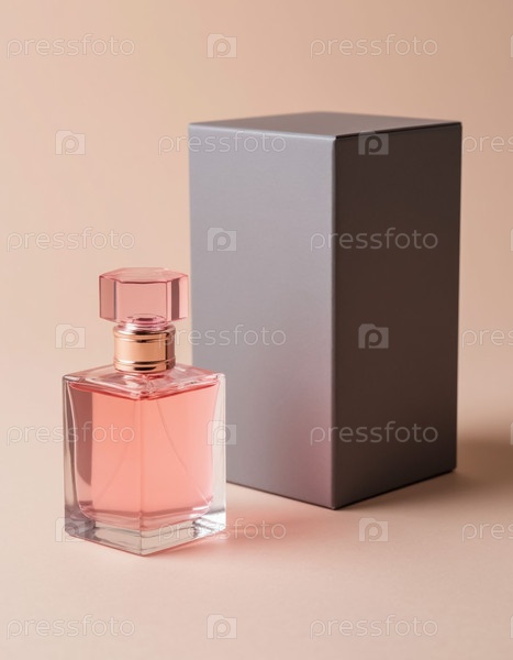 Розовая стеклянная бутылка с парфюмом на пастельном фоне