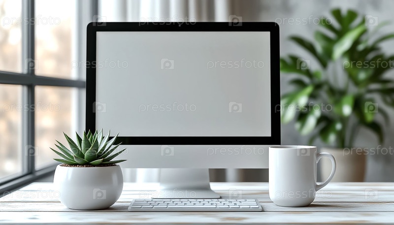 Минималистский белый стол с белым монитором от окна, созданный искусственным интеллектом