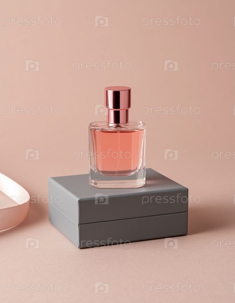 Розовая стеклянная бутылка с парфюмом на пастельном фоне