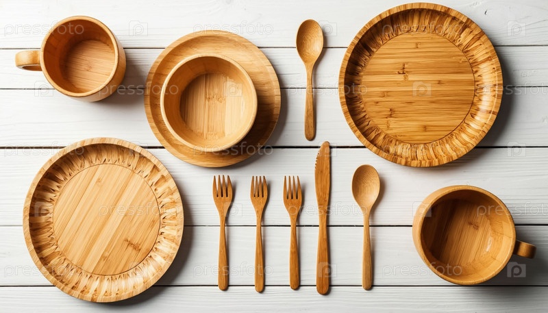 Экологически чистые деревянные посуды на белом деревянном столе