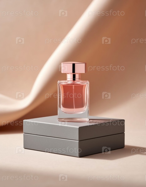 Розовая стеклянная бутылка с парфюмом на пастельном фоне