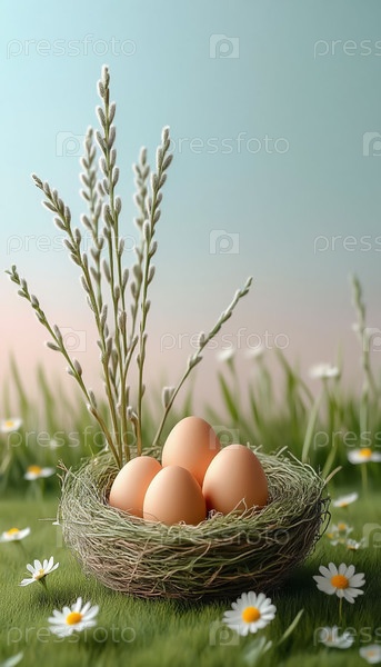 Естественное пасхальное гнездо с яйцами и салютой Минималист