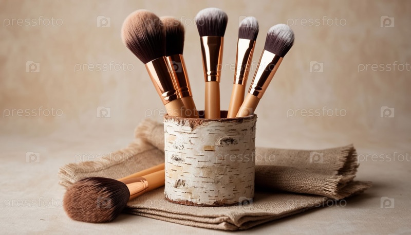 Штуки для макияжа в трубке из березовой коры на розовом пастельном фоне