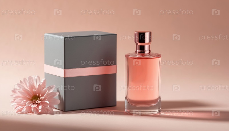 Розовая стеклянная бутылка с парфюмом на пастельном фоне