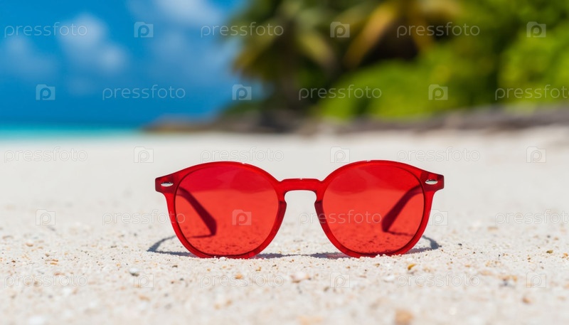 Красные солнцезащитные очки на пляже с белым песком